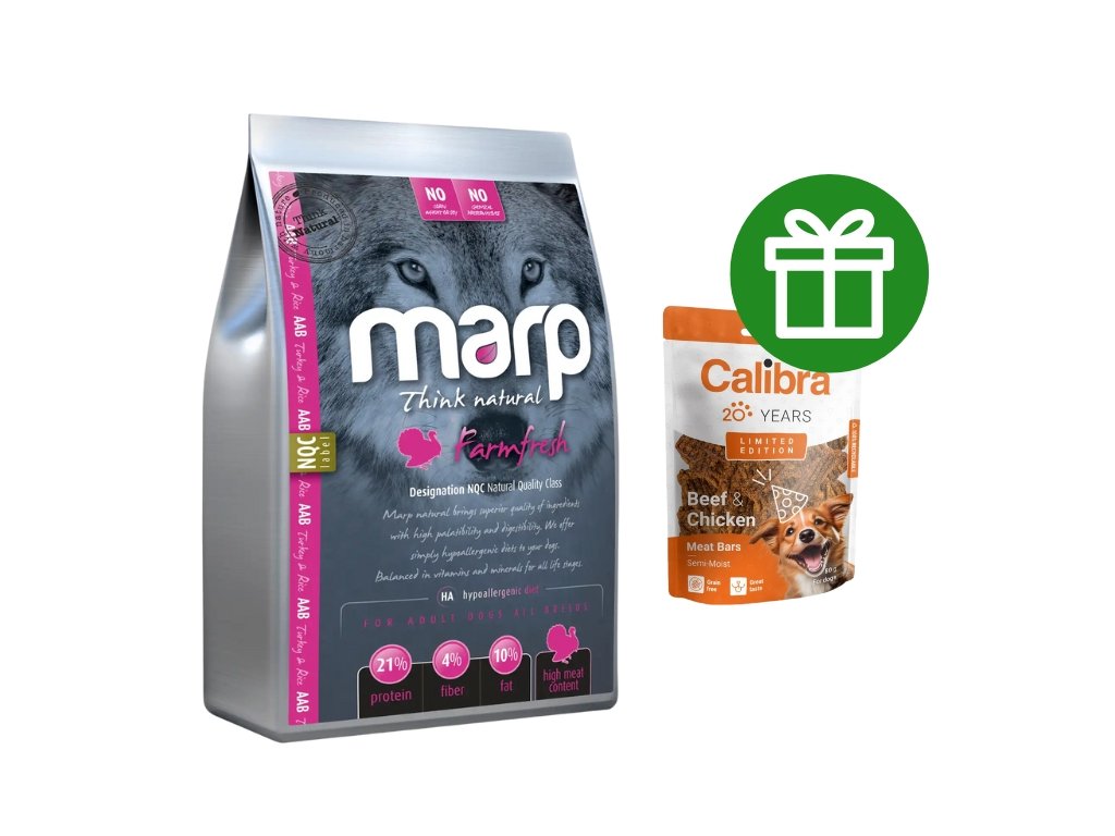 Marp Natural Farmfresh Turkey - přírodní krmivo pro dospělé psy všech plemen. Jediným zdrojem bílkovin je maso z krůty. Vhodné jako hypoalergenní dieta i pro pejsky s citlivým zažíváním. Granule jsou chutné a vysoce stravitelné. Pro zdravou a lesklou srst je zde správně vyvážen poměr Omega 3 a Omega 6, s přídavkem zinku, biotinu a lněného semínka. Přírodní receptura bez chemických konzervantů, barviv a hormonů. Granule neobsahují sůl.