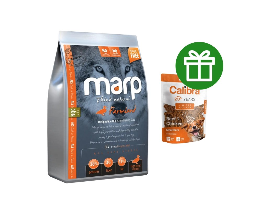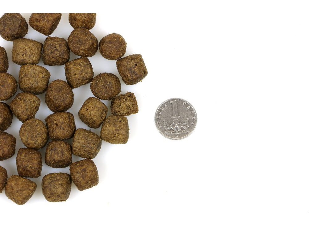 Složení: Sušené kachní maso, Brambory, Hrášek, Řepné řízky, Drůbeží tuk, Pivovarské kvasnice, Lněné semínko, Minerály, Vitaminy. Garantované jakostní znaky: Hrubá bílkovina 26%, Hrubé tuky 12%, Hrubá vláknina 4%, Popeloviny 9%, Vlhkost 8,5%, Calcium 1,63%, Fosfor 1,19%, Omega 3 0,64%, Omega 6 2,42% Vitamíny: Vitamin A 15,000 IU/kg, Vitamin D3 2,250 IU/kg, Biotin 150 mcg/kg Stopové prvky: Síran železnatý 167 mg/Kg (Iron 50mg/kg), Síran zinečnatý 139 mg/kg (Zinc 50 mg/kg), Síran manganatý 109 mg/kg (Maganese 35 mg/kg), Síran měďnatý 60 mg/kg (Copper 15mg/kg), Jodičnan vápenatý 1,64 mg/kg (Iodine 1mg/kg), Selenid sodný 0,67mg/kg (Selenium 0,3mg/kg). Konzervace: Vitamin E, Rozmarýn, Tokoferoly Krmný návod: 1-5kg = 30-100g 5-20kg = 100-300g 20-30kg = 300-400g 30+kg = 400+g