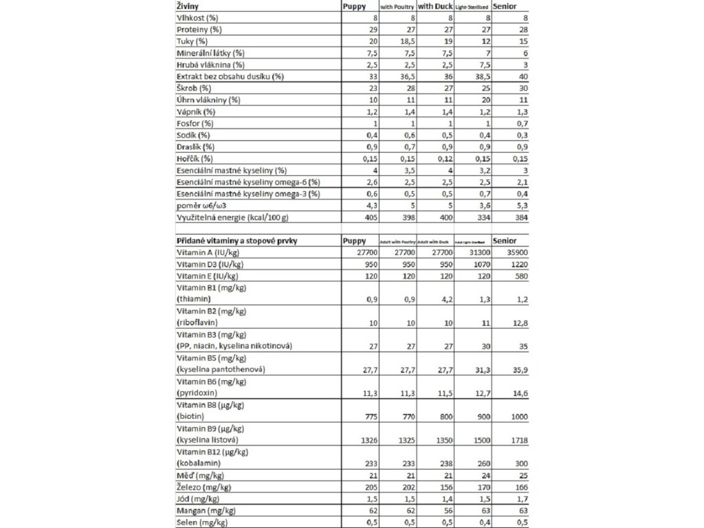 ANALYTICKÉ SLOŽENÍ : hrubý protein 28 %, hrubý tuk 15,5 %, hrubá vláknina 3%, hrubý popel 6%, vápník 1,1%, fosfor 0,7%, esenciální omega-6 mastné kyseliny 2,3 %, esenciální omega-3 mastné kyseliny 1,4%.