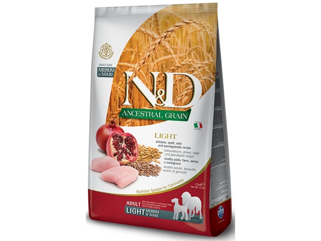 Receptura s kuřecím masem a granátovým jablkem pro dospělé psy s potřebou snížit tělesnou hmotnost. Pro psy středních a velkých plemen.