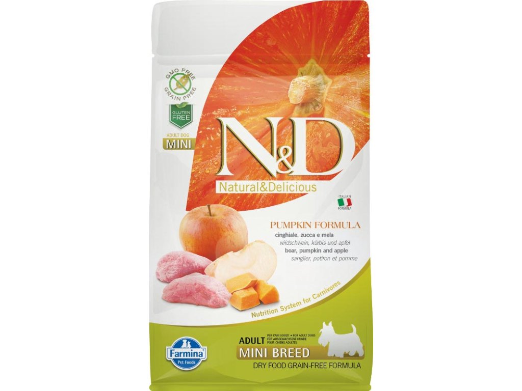 Italské holistické krmivo bez obilovin s divočákem, jablkem a dýní pro dospělé psy malých plemen. Proč dýně?