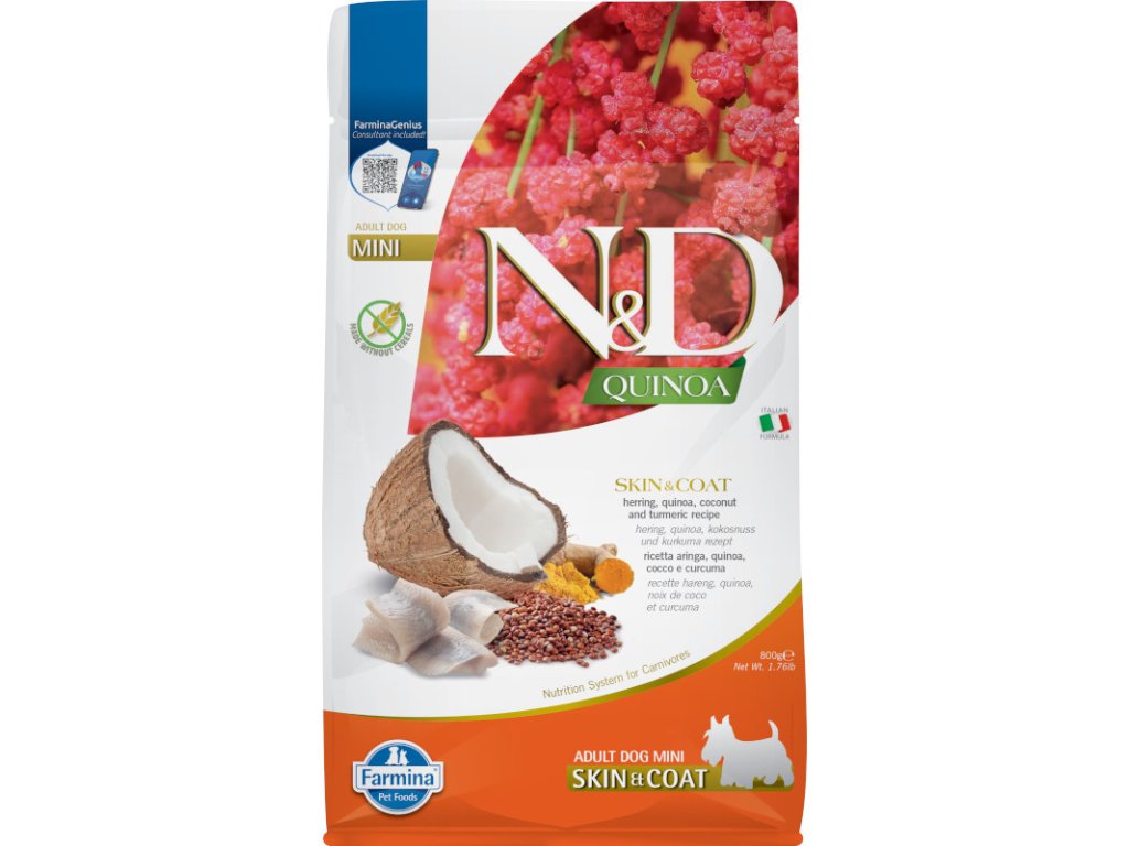 Vyvážené funkční krmivo pro dospělé psy malých plemen při nežádoucí reakci na potravu pro navrácení a udržení zdraví kůže a srsti. Hlavním zdrojem vysoce kvalitních bílkovin v krmivu je hypoalergenní sleď. Přidaná quinoa v bio kvalitě pěstovaná v Itálii podporuje trávení, absorpci živin a celkově zdraví trávicího traktu. Dále je bohatá na vzácné aminokyseliny a přírodní antioxidanty a má nízký glykemický index. Rybí olej zaručuje optimální poměr omega-3 a omega-6 mastných kyselin pro dobrou kondici kůže a srsti a její regenerační schopnost. Přídavek glukosaminu a chondroitinu vyživuje kloubní chrupavky, stimuluje růst a ochraňuje klouby. Krmivo neobsahuje obiloviny, geneticky modifikované suroviny, umělá barviva, bílkoviny ze sóji, hormonální ani antibiotická rezidua.