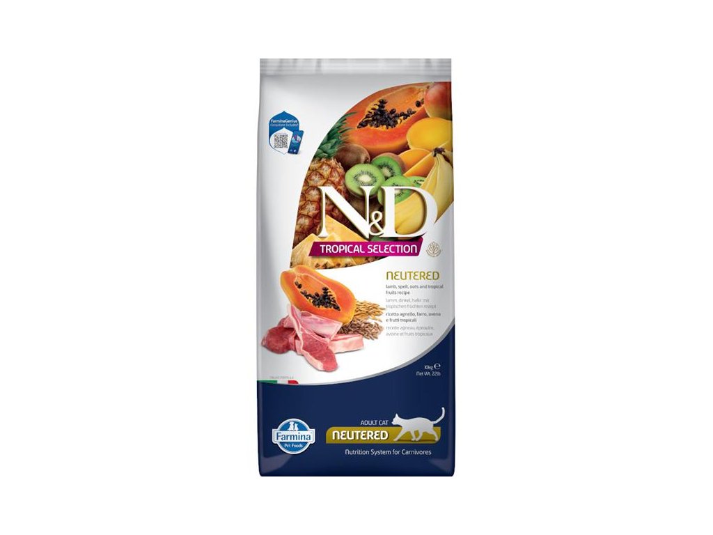 Kompletní nízkoobilné krmivo s jehněčím masem a tropickým ovocem pro dospělé kastrované kočky. Řada N&D Tropical selection v sobě kombinuje kvalitní zdroje živočišných bílkovin, vysoce kvalitní obiloviny a chutné tropické ovoce pro nasycení vašeho zvířecího kamaráda.Granule řady Tropical selection navazují na řadu nízkoobilných krmiv Ancestral Grain, v nichž je maso doplněno ovsem a špaldou. Tyto „staré obilniny“ se vyznačují nízkým glykemickým indexem a tím prodlužují dobu sytosti. Chutnost krmiva zvyšuje přidané tropické ovoce, jako je papája, mango, kiwi, ananas a banán, bohaté na přírodní antioxidanty a vitamíny.