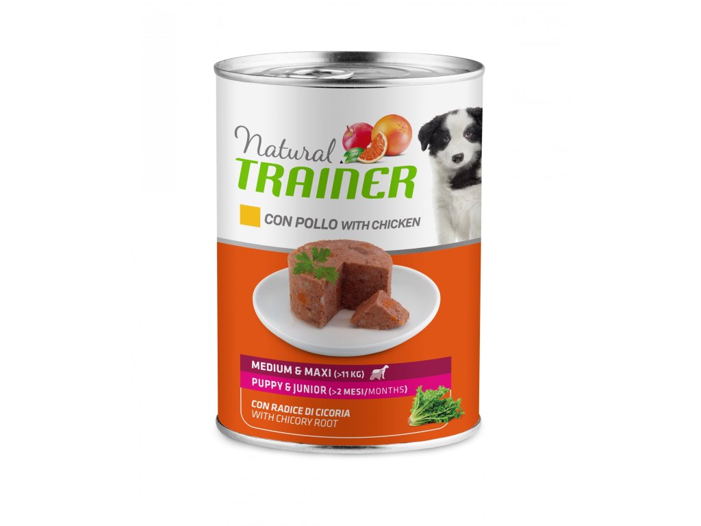Konzerva plná plnohodnotných ingrediencí od firmy Natural Trainer je určena pro štěňata a juniory středních a velkých plemen a zaručeně potěší každého psa. Bílkovinovou složkou je zde kuřecí maso bohaté na esenciální aminokyseliny a se sníženým obsahem tuků a soli. Kuře obsahuje vitaminy skupiny B, zejména thiamin, riboflavin a niacin, a také minerály jako fosfor, hořčík, železo, zinek, vápník a selen. Udělejte radost svému novému přírůstku do rodiny a sáhněte po kvalitní mokré stravě od firmy Natural Trainer.