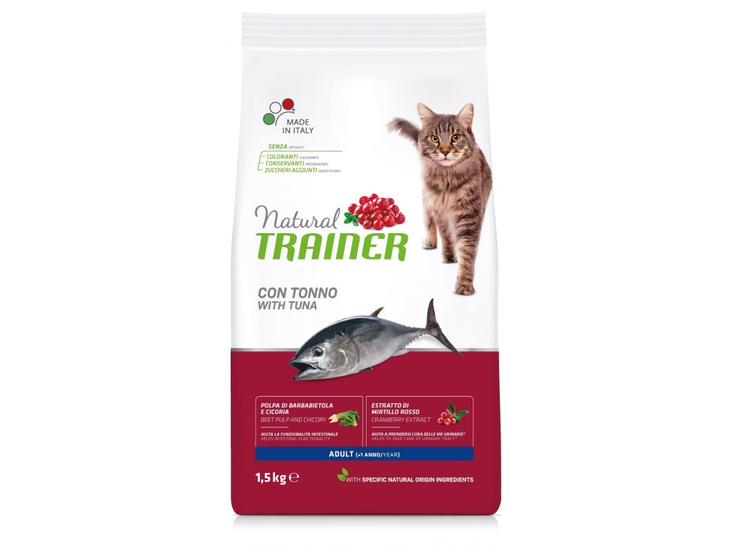 Krmivo Natural Trainer Cat Adult tuňák je určené pro dospělé kočky (1-7 let). Snadno stravitelné granule s obsahem kvalitního masa z tuňáka jsou ideální pro každou kočku. Krmivo má nejen výbornou chuť, ale zároveň dodá vašemu mazlíčkovi všechny potřebné živiny, vitaminy a minerální látky ve správném poměru. Obohaceno o Pomega3 (100 % jablečné omega-3 mastné kyseliny), Algae spirulina pro hebkou a přirozeně zbarvenou srst a extrakt z brusinek pro správné fungování močového ústrojí. Bez konzervantů, barviv a ochucovadel.