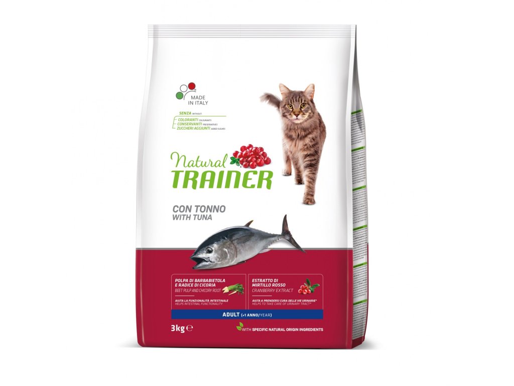 Krmivo Natural Trainer Cat Adult tuňák je určené pro dospělé kočky (1-7 let). Snadno stravitelné granule s obsahem kvalitního masa z tuňáka jsou ideální pro každou kočku. Krmivo má nejen výbornou chuť, ale zároveň dodá vašemu mazlíčkovi všechny potřebné živiny, vitaminy a minerální látky ve správném poměru. Obohaceno o Pomega3 (100 % jablečné omega-3 mastné kyseliny), Algae spirulina pro hebkou a přirozeně zbarvenou srst a extrakt z brusinek pro správné fungování močového ústrojí. Bez konzervantů, barviv a ochucovadel.