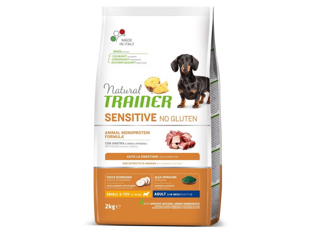 Kompletní krmení pro psí alergiky nebo jen pořádné mlsouny. Trainer Natural Sensitive je unikátní krmivo právě díky monoproteinovému složení. Použití dehydrovaného kachního masa jako jediného zdroje živočišného proteinu není tak časté, stejně jako rýže, jediného zdroje lehce vstřebatelného karbohydrátu a kukuřičného oleje, jako jediného zdroje tuku. Snadno tak můžete detekovat, na jaké potraviny je váš pes alergický a zvolit monoprotein, který mu zaručí opětovnou radost z jídla. Pokud je váš pes pouze velmi rozmlsaný, monoprotein zaručí, že se vyvarujete příměsím, které mu nechutnají. Voňavá kachna s rýží je bez lepku a je ideální pro dospělé psy malých plemen. Granule jsou vyrobené tak, aby chutnaly a byly zároveň snadno stravitelné. Praktické malé balení.