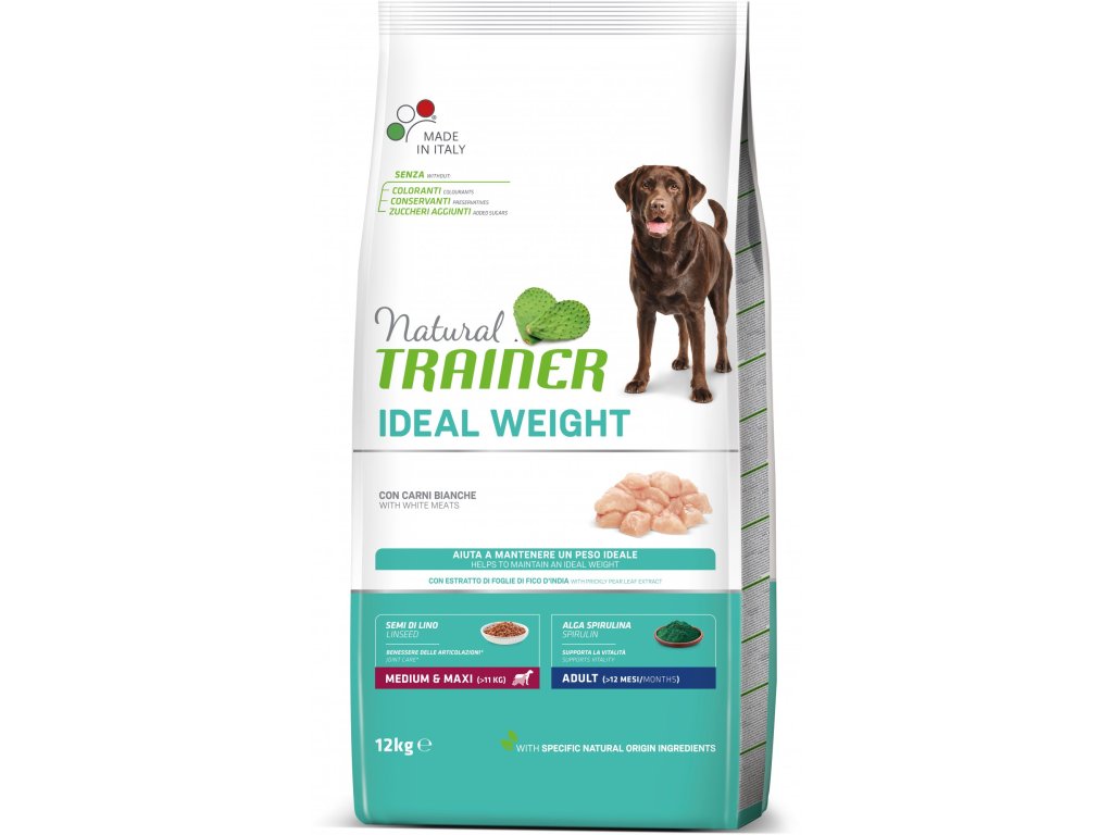 Krmivo speciálně navržené pro dospělé psy středních a velkých plemen (nad 11 kg), kteří mají problémy s nadváhou. Někteří psi mají z různých důvodů větší sklony k tloustnutí a problémy se nadváhy zbavit. Konkrétně pro ně je navrženo toto krmivo, které obsahuje dietní bílé kuřecí a krůtí maso. Proto krmivo Trainer Natural obsahuje složky pro udržení zdravých kloubů, šlach a svalů, mimo jiné lněné semínko, a je doplněné o řasu Spirulina, která celkově podporuje vitalitu. Krmivo má lahodnou chuť kuřete, které neodolá ani ten nejmlsnější psí jazýček, a zároveň dodá vašemu mazlíčkovi vše, co potřebuje pro spokojený život a pomůže mu udržet si zdravou váhu. Bez barviv, konzervantů a přidaných cukrů. Vyrobeno v Itálii z čerstvého italského masa.
