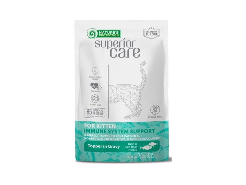Doplňkové vlhké krmivo ve formě praktické kapsičky je ideální pro koťata a podporu jejich vyvíjejícího se imunitního systému. Tuňák a mořský vlk poskytují vysoce kvalitní bílkoviny a esenciální omega-3 mastné kyseliny, které podporují růst. Kapsička může posloužit jako chutný a výživný topper (poleva) na granule pro zlepšení trávení, zvýšení hydratace a celkovou podporu zdraví v období vývinu.