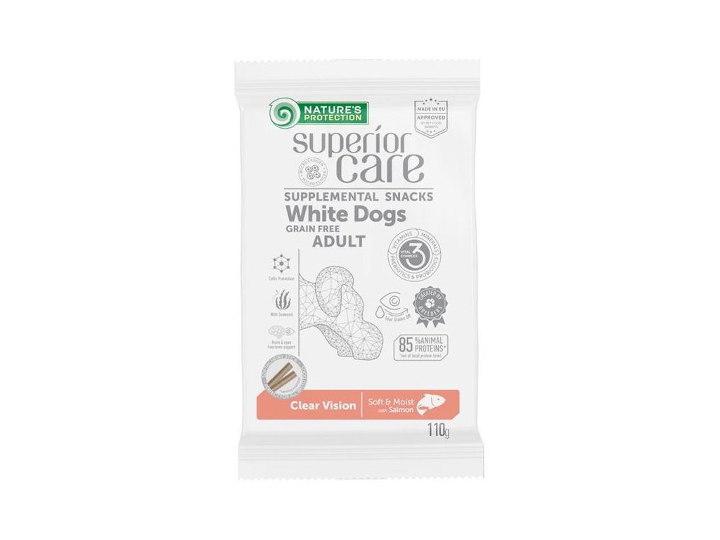 Tento funkční doplněk stravy je určený pro dospělé psy všech plemen s bílou nebo světlou srstí, kterým pomáhá udržet zdravý zrak a čiré složení slz. Hlavním zdrojem bílkovin je vysoce stravitelný losos. Pamlsky obsahují mořské řasy, které podporují správný vývoj mozku a zraku a jsou vynikajícím zdrojem železa. Přírodní antioxidanty vitamín E a extrakt ze zeleného čaje pomáhají chránit buňky před škodlivými účinky volných radikálů. Pochoutky neobsahují obilniny, kukuřici ani sójové produkty, takže jsou vhodné i pro alergické psy s citlivým trávicím systémem.