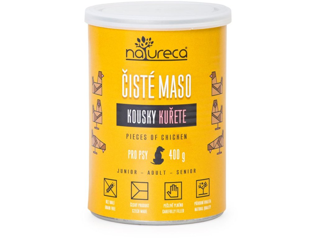 Konzerva s obsahem nasekaných kousků kuřete i s kostmi je díky své kvalitě vhodná pro psy všech plemen a věkových kategorií, pro zvíře s nadváhou i trávicími obtížemi. Pomocí vysokého tlaku a teploty při výrobě jsou kosti v krmivu rozvařené. Vysoký obsah bílkovin pozitivně ovlivňuje tvorbu obranných látek, podporuje stavbu těla a zdravý pohyb psa. Hořčík, sodík a vápník v přírodní formě napomáhají správné funkci svalů a nervů a příznivě působí na zpevňování kostí v kloubech.Poctivá masová konzerva kousky kuřete je výbornou volbou pro ty, kterým není jedno, čím krmí svého psa. Kvalitní 100% masová konzerva je vhodná pro všechny věkové kategorie a plemena psů.Všechny naše konzervy pro psy a kočky jsou přírodní a bez jakýchkoliv barviv, aromat, konzervantů, chemikálií, obilovin nebo sóji.Výroba našich konzerv je pod stálým státním veterinárním dozorem. Uchovejte v chladu a suchu. Datum spotřeby je uvedeno na obalu.Maso je neoddelitelnou součástí každodenního jídelníčku psa. Dodává mu potřebnou energii, ale je také bohaté na minerálne látky. V neposlední řade psům moc chutná.Krajina původu: Česká republika Krmný návod: podává se při pokojové teplotě. Po otevření uchovejte v chladu. Složení: 100% kuře Analýza: hrubý protein 16 %, hrubý tuk 11 %, hrubá vláknina 0,5 %, hrubý popel 2,5 %,vlhkost 70 %, vysoký přirozený obsah vitamínů (A, E, D), aminokyselin (lysin, methionín, cystín) a minerálů Doporučená krmní dávka: hmotnost psa – denní dávka5kg – 200g | 10kg – 400g | 20kg – 600g | 30kg – 800g
