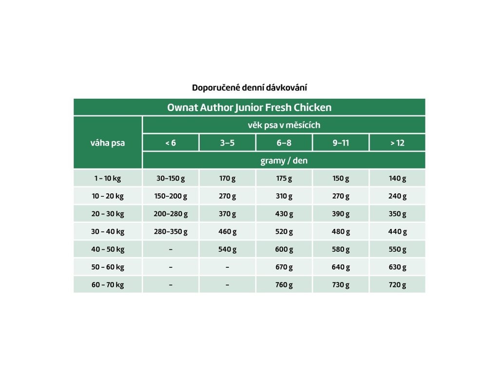 OWNAT Junior Fresh Chicken – Dokonalá výživa pro zdravý růst štěňat! Chcete zajistit svému štěněti ten nejlepší start do života? OWNAT Junior Fresh Chicken je krmivo speciálně vyvinuté pro potřeby rostoucích psů. S čerstvým kuřecím masem jako hlavní složkou poskytuje toto krmivo vše, co vaše štěně potřebuje pro zdravý růst, silné kosti a vyvážený vývoj. Proč zvolit OWNAT Junior Fresh Chicken pro vaše štěně? Čerstvé kuřecí maso: Krmivo obsahuje vysoký podíl čerstvého kuřecího masa, které je skvělým zdrojem vysoce kvalitních bílkovin, nezbytných pro růst a vývoj vašeho štěněte. Speciálně pro štěňata: Vyvážená receptura bohatá na živiny, vitamíny a minerály podporuje zdravý vývoj kostí, svalů a imunitního systému. Bez umělých přísad: Krmivo je vyrobeno bez umělých konzervantů, barviv a dochucovadel, takže můžete mít jistotu, že svému štěněti dáváte jen to nejlepší. Podpora zdravého trávení: Díky pečlivě vybraným přírodním ingrediencím je krmivo snadno stravitelné, což je klíčové pro citlivá štěněcí bříška. S OWNAT Junior Fresh Chicken můžete mít jistotu, že vaše štěně dostává všechny potřebné živiny pro svůj zdravý růst a aktivní život. Je to ideální volba pro majitele, kteří chtějí svému štěněti poskytnout výživu, která podpoří jeho energii a vitalitu.  SLOŽENÍ: Čerstvé kuře* (60 % min. před vytlačováním), hnědá rýže* (12 %), dehydratované brambory* (8 %), celá kukuřice* (5 %), celý hrách* (5 %), drůbeží tuk (konzervovaný přírodními antioxidanty), lososový olej (konzervovaný přírodními antioxidanty), pivovarské kvasnice* (1,5 %), řepná řízky, čerstvá zelenina před vytlačením (dýně* 0,5 %), kamenná sůl*, kořeny čekanky (FOS)*, kvasnicový extrakt (MOS), sušené mořské řasy*, glukosamin (500 mg/kg), juka schidigera, zázvor* (150 mg/kg), goji bobule* (150 mg/kg), chondroitin sulfát (100 mg/kg). *Přírodní ingredience ANALYTICKÉ SLOŽKY: Protein: 29 %, obsah tuku: 17 %, hrubá vláknina: 2 %, obsah anorganických látek: 8 %, vlhkost: 8 %, omega 6: 2,7 %, omega 3: 0,45 %, vápník: 1,5 %, fosfor: 1,1 %. DOPLŇKOVÉ LÁTKY/kg: Výživové doplňky: Vitamin A 28.000 IU, vitamin D3 1.000 IU, vitamin E 350 IU, taurin 1.500 mg, L-karnitin 150 mg, měď (chelát mědi aminokyselin hydrát) 10 mg, mangan (chelát manganu aminokyselin hydrát) 54 mg, železo (zeleznaty chelát lysinu a kyseliny glutamové) 40 mg, zinek (chelát zinku a aminokyselin, hydrát) 120 mg, jód (jodid draselný) 4 mg, selen (zinek-L-selenomethionin) 0,1 mg.  S přírodními antioxidanty. Balení: 10 kg