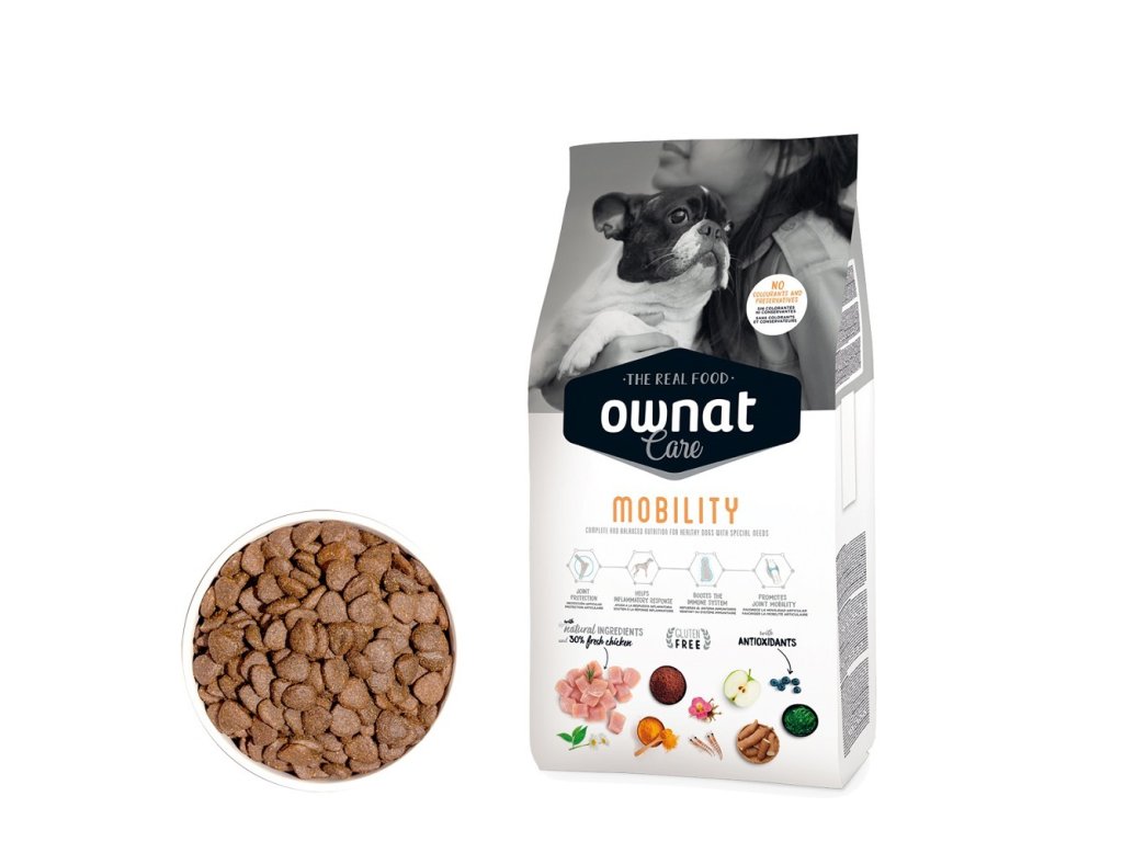 OWNAT CARE MOBILITY je určen psům s citlivými klouby, v růstové fázi, stejně jako dospělým a seniorům. Obsahuje střední obsah kalorií, aby se předešlo přibírání na váze, a funkční složky pro zlepšení zdraví kloubů.