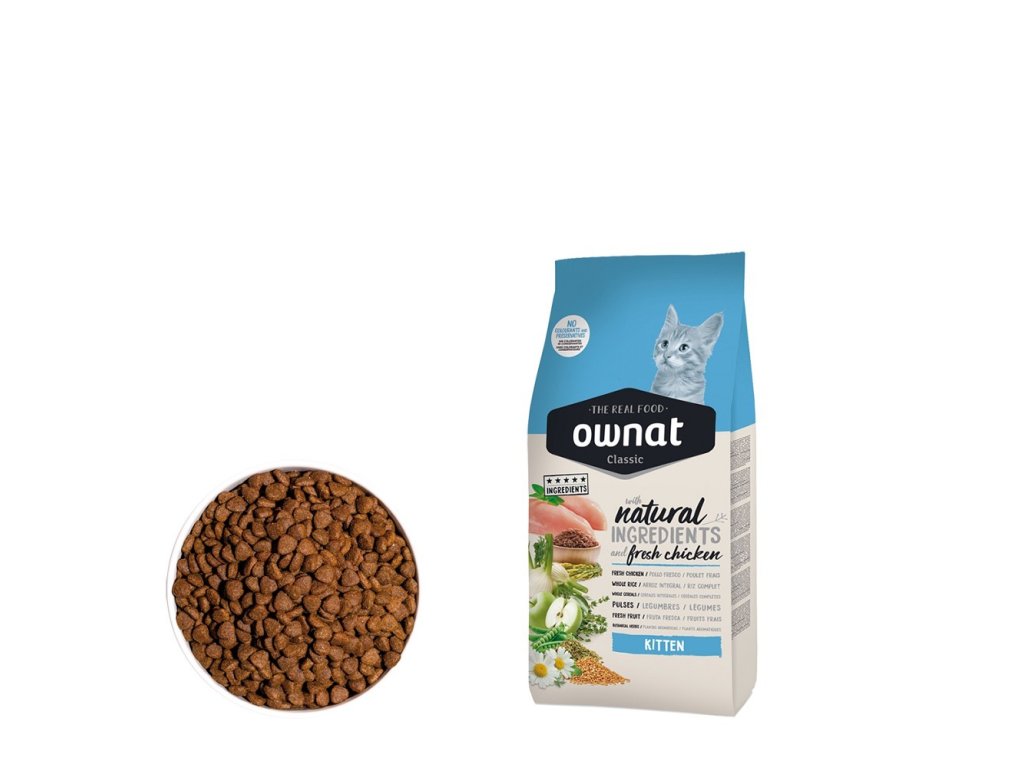 OWNAT CLASSIC CAT Kitten je speciálně navržené krmivo pro koťata, které poskytuje všechny nezbytné živiny pro správný růst a vývoj. Krmivo obsahuje vysoký podíl bílkovin z kvalitního kuřecího masa, které podporují růst svalů a rozvoj kostry. Díky pečlivě vybraným ingrediencím je strava snadno stravitelná a podporuje zdravé trávení a imunitní systém rostoucích koťat.