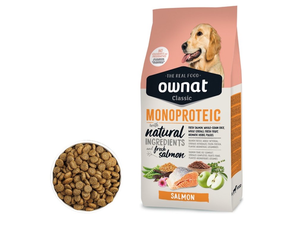 OWNAT CLASSIC MONOPROTEIC DOG Salmon je ideální volbou pro majitele psů, kteří chtějí svým mazlíčkům poskytnout kvalitní krmivo s jediným zdrojem bílkovin, které je chutné, výživné a šetrné k jejich zažívacímu systému. .