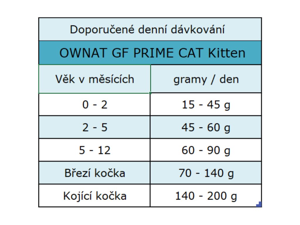 OWNAT GF PRIME CAT Kitten je ideální krmivo pro rostoucí koťata. Je navrženo tak, aby poskytovalo všechny klíčové živiny nezbytné pro správný růst a vývoj koťat. Čerstvé maso z kuřete a krůty zajišťuje dostatek kvalitních bílkovin pro růst svalů a rozvoj silné kostry. Tento bezobilný recept je snadno stravitelný a podporuje zdravé trávení a imunitní systém.