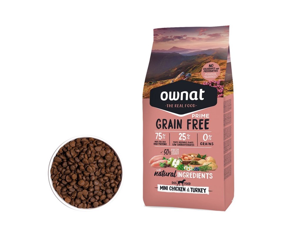 OWNAT GF PRIME DOG Mini Chicken & Turkey je ideální volbou pro majitele malých psů, kteří chtějí svým mazlíčkům dopřát kvalitní, hypoalergenní krmivo s kuřecím a krůtím masem.