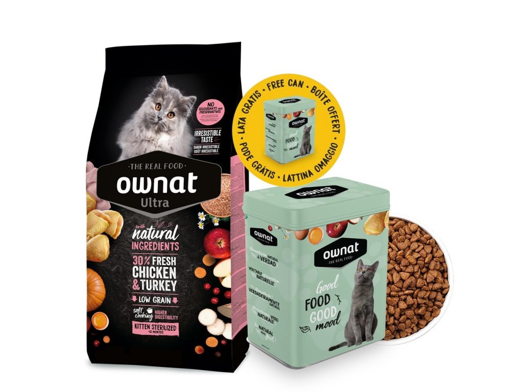 Ownat Ultra Kitten Sterilized je určené pro kastrovaná koťata, která mají nižší energetické nároky, ale stále potřebují výživu bohatou na bílkoviny pro správný růst a vývoj. Obsahuje 30 % čerstvého kuřecího a krůtího masa, které poskytuje vysoce hodnotné bílkoviny s vynikající stravitelností. Snížený obsah kalorií pomáhá předcházet nadváze.