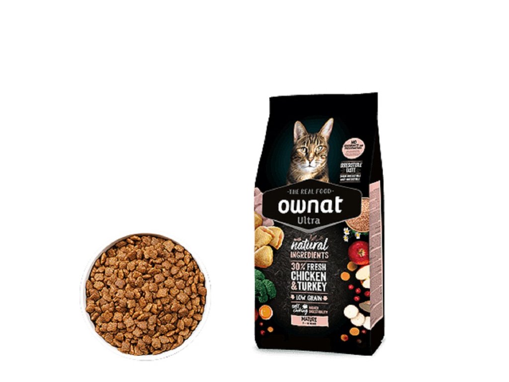 Ownat Ultra Mature je vyvážené krmivo vytvořené na míru nutričním potřebám starších koček od věku 7 let. Obsahuje 30 % čerstvého kuřecího a krůtího masa, doplněného o vejce, rybí proteiny a další funkční složky, které zajišťují skvělou chutnost a optimální trávení i výživu v pokročilejším věku.