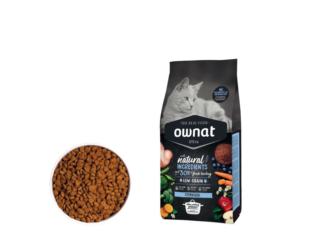 OWNAT ULTRA CAT Sterilized je speciálně formulované krmivo pro sterilizované kočky, které mají tendenci přibírat na váze. Toto krmivo je navrženo s nižším obsahem tuku, ale s vysokým podílem bílkovin, aby udrželo svalovou hmotu a zajistilo optimální tělesnou kondici. Čerstvé krůtí maso je hlavní složkou a přidává na chuti i výživné hodnotě. Přídavné složky, jako jsou jablka a brusinky, dodávají přírodní antioxidanty a podporují zdraví močového systému.