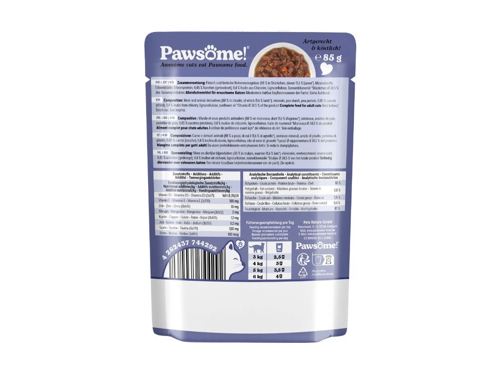 Kočky jsou masožravci, a proto krmivo Pawsome! obsahuje velké množství živočišných bílkovin a nenajdete v něm obiloviny ani přidaný cukr – protože ani jedno do kočičí misky nepatří. Je vytvořeno tak, aby poskytovalo kočkám jedinečný chuťový zážitek a zároveň jim dodalo živiny, nezbytné pro jejich každodenní dobrodružství.