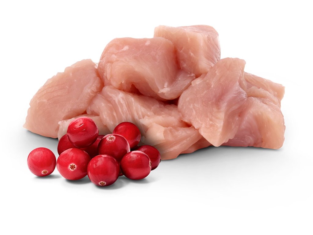 Složení: maso a vedlejší výrobky živočišného původu (kousky masa 88 %, z toho krůtí maso 40,6 %), minerální látky, lososový olej 1 %, hrachový škrob, hrachová bílkovina, čekankový inulin 0,4 %, lignocelulóza, sušené brusinky 0,1 %