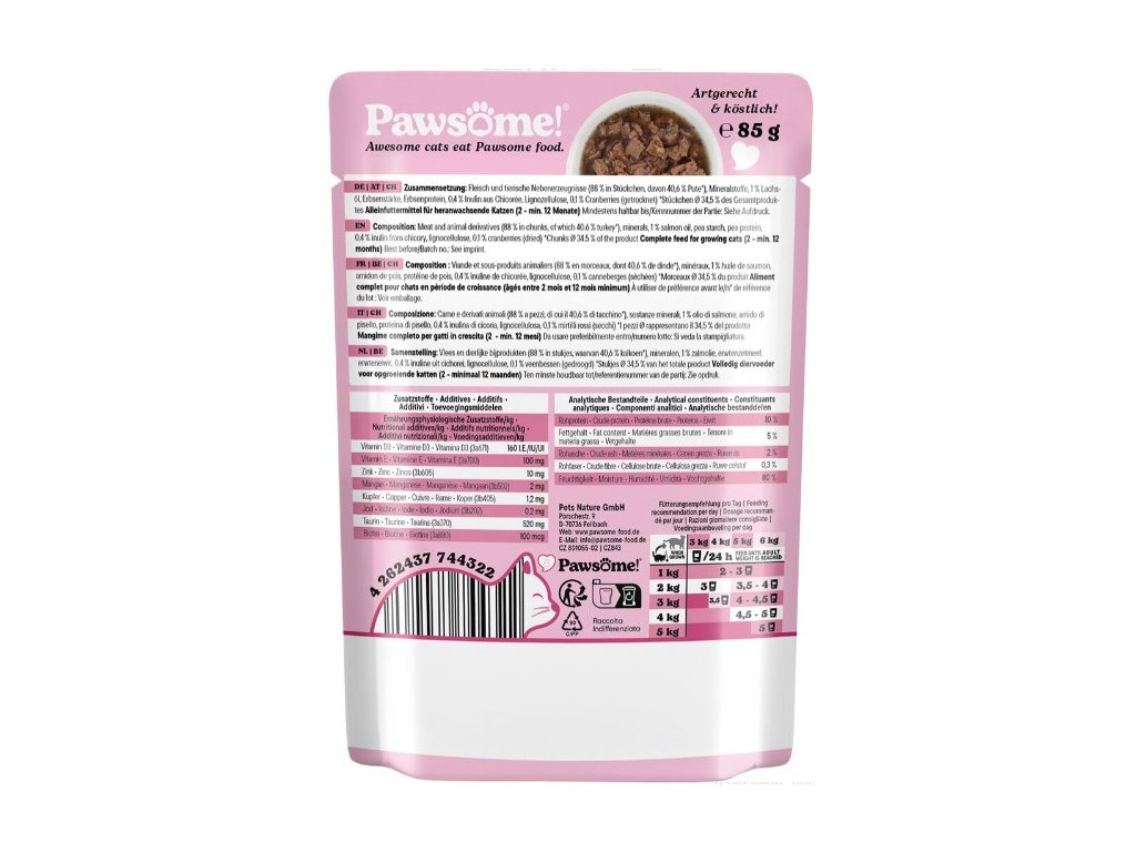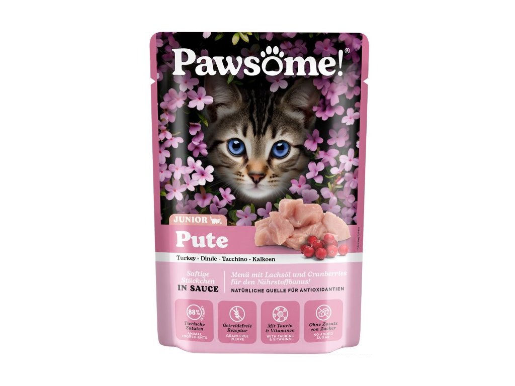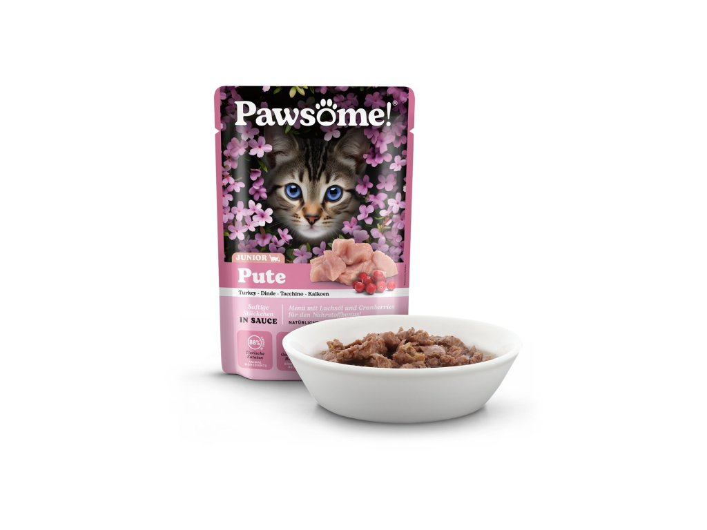 Šťavnaté měkké kousky s krůtím masem, lososovým olejem a brusinkami v lahodné omáčce představují kompletní krmivo s vyváženým podílem bílkovin, tuků, vitamínů a minerálů, které přispívá ke zdravému vývoji a růstu mladých koček do 12 měsíců věku.