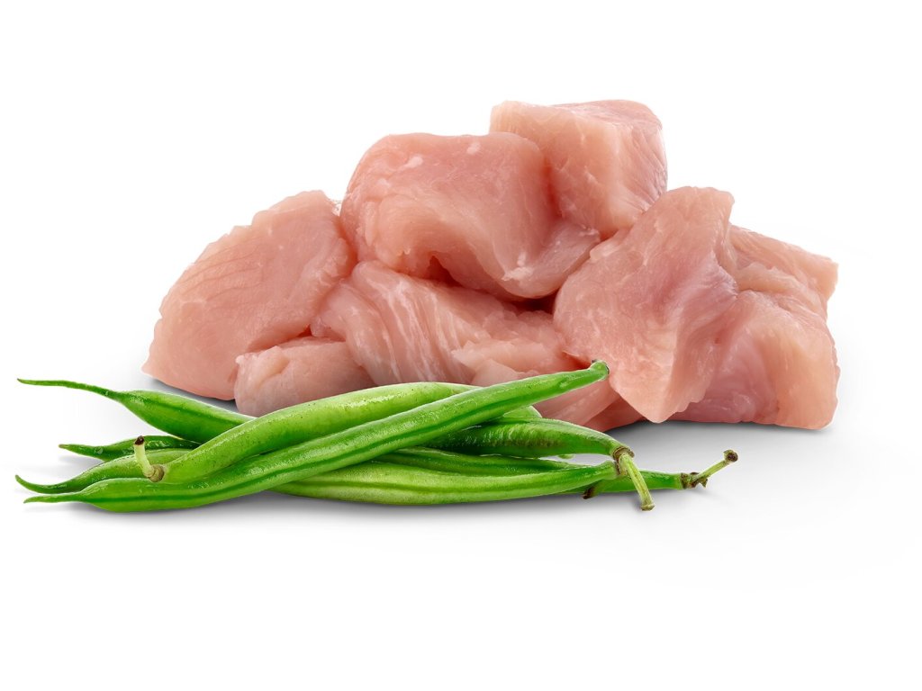 Složení: maso a vedlejší výrobky živočišného původu (kousky masa 88 %, z toho krůtí maso 11,6 %), minerální látky, hrachový škrob, hrachová bílkovina, sušené zelené fazole 0,45 %, čekankový inulin 0,4 %, lignocelulóza, slunečnicový olej