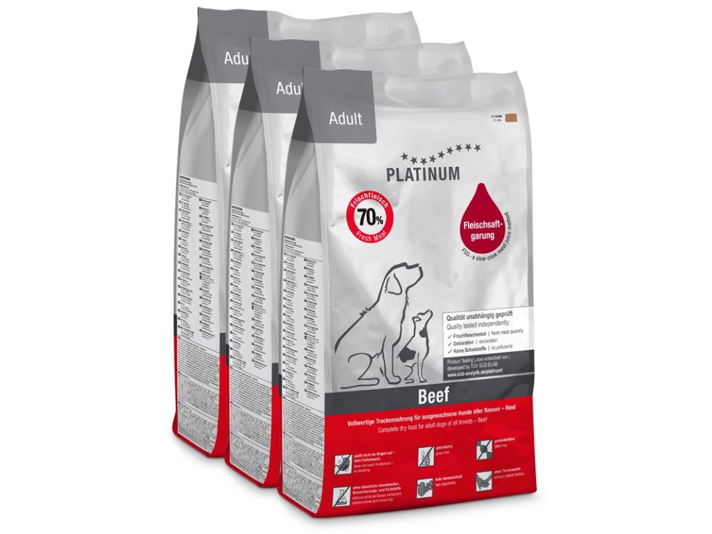 Platinum Natural Adult Beef & Potato je superprémiové krmivo s nulovým obsahem obilovin pro dospělé psy všech plemen. Díky svému přírodnímu složení je snadno stravitelné. Vyhovuje nutričním požadavkům psů s citlivým zažíváním a problematickou střevní mikroflórou.