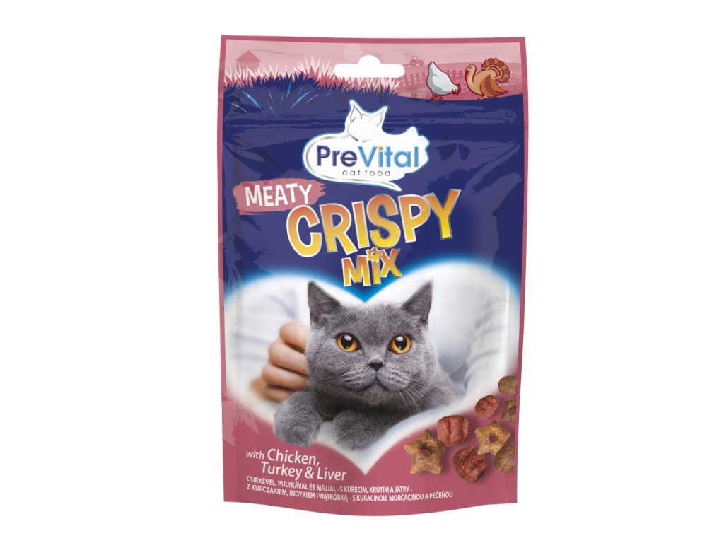 Pamlsek pro kočky ve formě křupavých granulí s kuřecím masem, krůtím a játry.