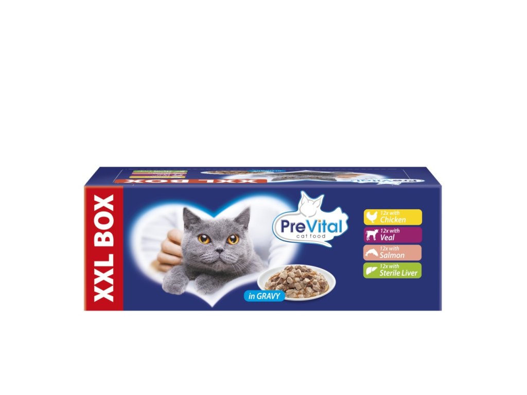 Kompletní mokré krmivo pro kočky s kuřecím, telecím a lososem.