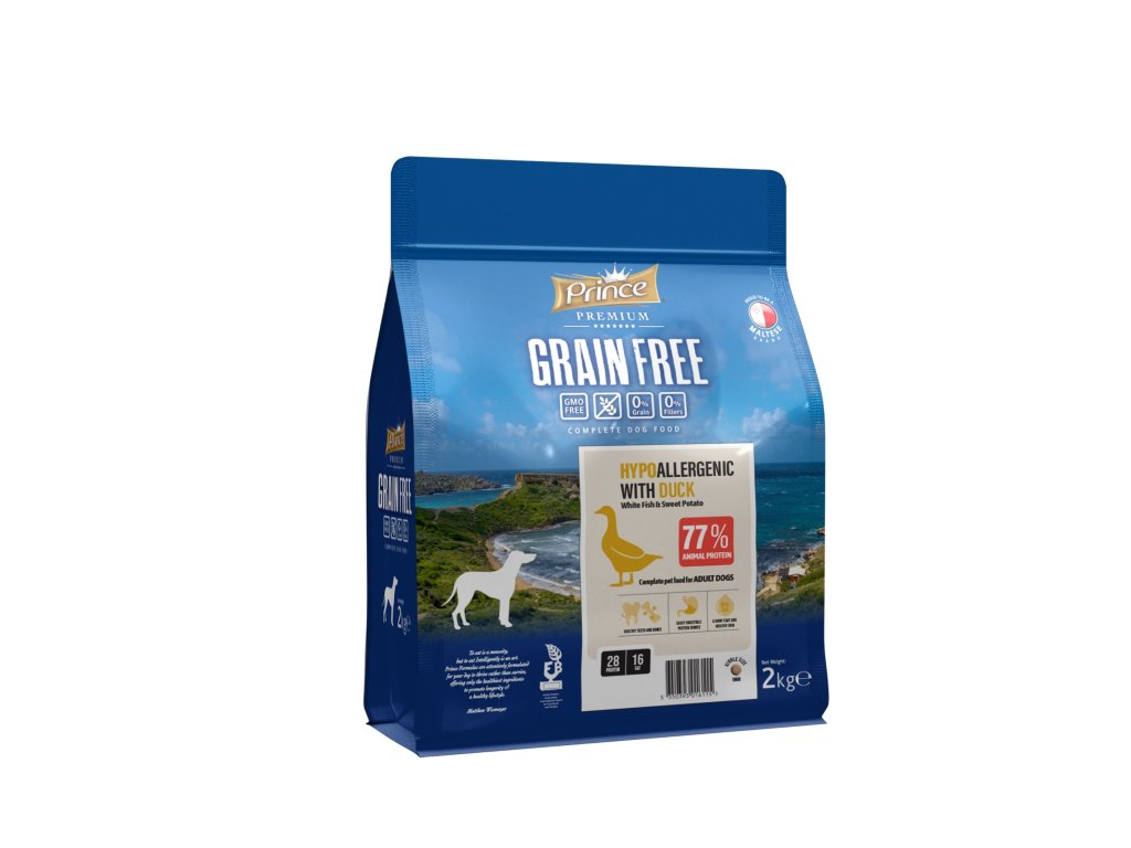 PRINCE HYPOALLERGENIC WITH DUCK 2KG - s kachnou, bílou rybou a sladkými bramboramikompletní krmivo pro dospělé psy věch věkových kategoriíPokud hledáte HYPOALERGENNÍ krmivo bez obilovin, bez lepku, bez GMO a bez plnidel, je řada PRINCE PREMIUM GRAIN FREE ta správná volba!Dopřejte svému pejskovi bezobilnou řadu PRINCE. Prémiové suché krmivo pro psy bez obilovin, pečlivě vyvinuté pro psy všech věkových kategorií. Kvalitní krmivo plné esenciálních živin. Tato výjimečná receptura přináší mnoho výhod, díky nimž bude váš mazlíček prospívat.3 klíčové vlastnosti: