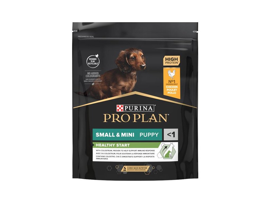 Krmivo Purina PRO PLAN® Healthy Start SMALL&MINI PUPPY je vhodné pro štěňata malých a trpasličích plemen (s hmotností do 10 kg v dospělosti). Tyto granule pro štěňata obsahují vitamín D, minerální látky a specifické množství omega-3 mastných kyselin (0,4 %), které přispívají ke zdraví zubů a dásní. Krmivo má vysoký podíl kvalitního kuřecího, a tak zajišťuje optimální výživu pro rostoucí štěňata malých a trpasličích plemen. To vše až do věku 12 měsíců, kdy přejdou na produkty řady ADULT.