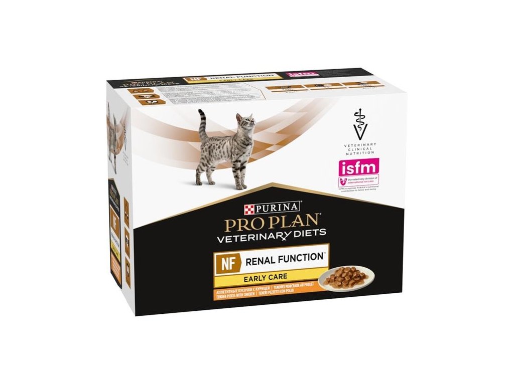 Kompletní dietní krmivo pro dospělé kočky ve formě kapsiček s kuřecím masem Pro Plan VD Feline NF Renal Early Care Chicken, určené k podpoře ledvin v případě chronické ledvinové nedostatečnosti v raném stádiu. Střední obsah bílkovin a nízký obsah fosforu pomáhá pečovat o ledviny v počáteční fázi onemocnění.