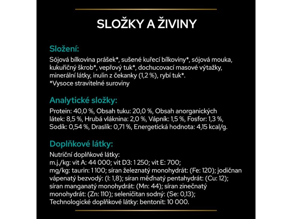 Doplňkové látky: m.j./kg: vit A: 44 000; vit D3: 1 250; vit E: 700; mg/kg: taurin: 1 100; 3b103: (Fe: 120); 3b202: (I: 1,8); 3b405: (Cu: 12); 3b503: (Mn: 44); 3b605: (Zn: 110); 3b801: (Se: 0,13); Technologické doplňkové látky: bentonit: 10 000.