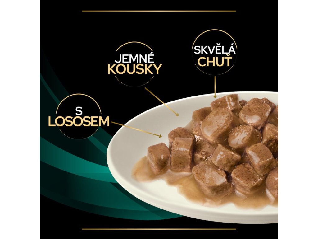 Složení: maso a výrobky živočišného původu, ryby a vedlejší výrobky z ryb (losos 4 %), vejce a výrobky z vajec, obiloviny, vedlejší výrobky rostlinného původu (hrachová vláknina 1,4 %), minerální látky, kvasnice, oleje a tuky, cukry. Vysoce stravitelné komponenty: vepřové (játra, ledviny), vedlejší výrobky z kuřete a krůty, sušená vejce, rýžová mouka, rybí tuk.