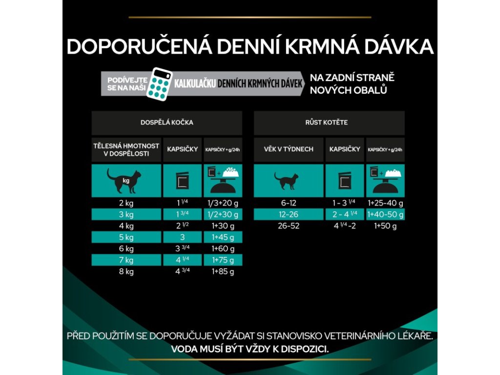 Krmný návod: Doporučená doba používání Feline EN je do 12 týdnů při střevních resorpčních onemocněních, pro nutriční obnovu a regeneraci, dokud není dosaženo úplné obnovy. Před použitím nebo před prodloužením doby používání a pro stanovení krmné dávky pro koťata se doporučuje vyžádat si stanovisko veterinárního lékaře. Voda musí být vždy k dispozici. Návody pro kombinované krmení jsou platné pouze pro současné podávání suchého a vlhkého krmiva Feline EN St/Ox Gastrointestinal™. 1 kapsička = 20 g granulí Feline EN St/Ox. Kočky s hmotností nad 6 kg: na každý další kg tělesné hmotnosti navyšte denní krmnou dávku o 1/2 kapsičky.