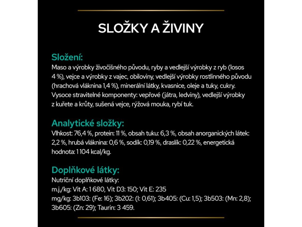 Doplňkové látky: Nutriční doplňkové látky: m.j./kg : Vit A : 1 680; Vit D3 : 235 mg/kg : 3b103 : (Fe: 16); 3b202 : (I: 0,61); 3b405 : (Cu: 1,5); 3b503 : (Mn: 2,8); 3b605 : (Zn: 29); Taurin : 3 459.