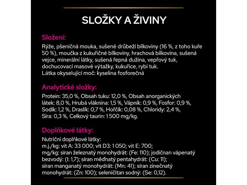 rýže, pšeničná mouka, sušené drůbeží bílkoviny (16 %, z toho kuře 50 %), moučka z kukuřičné bílkoviny, hrachová bílkovina, sušená vejce, minerální látky, sušená řepná dužina, vepřový tuk, dochucovací masové výtažky, kukuřice, rybí tuk, látka okyselující moč: kyselina fosforečná.