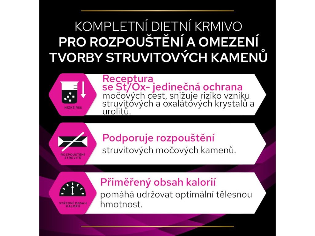 Kompletní dietní krmivo pro dospělé kočky určené k rozpouštění struvitových kamenů a k omezení jejich opakované tvorby. Krmivo s nízkým obsahem hořčíku, se schopností okyselovat moč a vytvářet nenasycenou moč omezující tvorbu struvitu. Krmivo je také určené pro nutriční management koček s onemocněním dolního močového ústrojí.