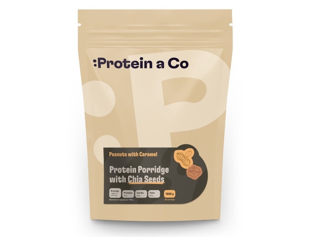 Složení: ovesné vločky (min. 35 %), 80% syrovátkový koncentrát (min. 25 %), arašídy (min. 6 %), karamelové hobliny (min. 6 %), chia semínka (min. 3 %), BIO kokosový cukr, sušené mléko