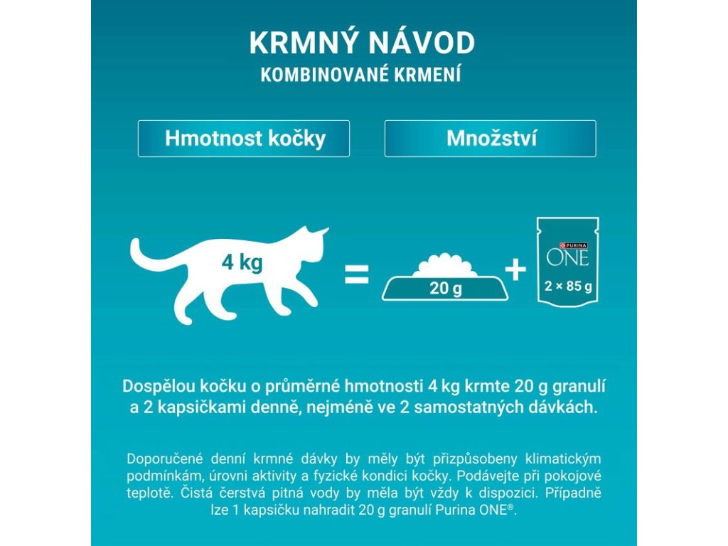 Doporučené denní krmné dávky by měly být přizpůsobeny klimatickým podmínkám, úrovni aktivity a fyzické kondici kočky. Podávejte při pokojové teplotě. Čistá čerstvá pitná voda by měla být vždy k dispozici. Případně lze 1 kapsičku nahradit 20 g granulí Purina ONE Adult.