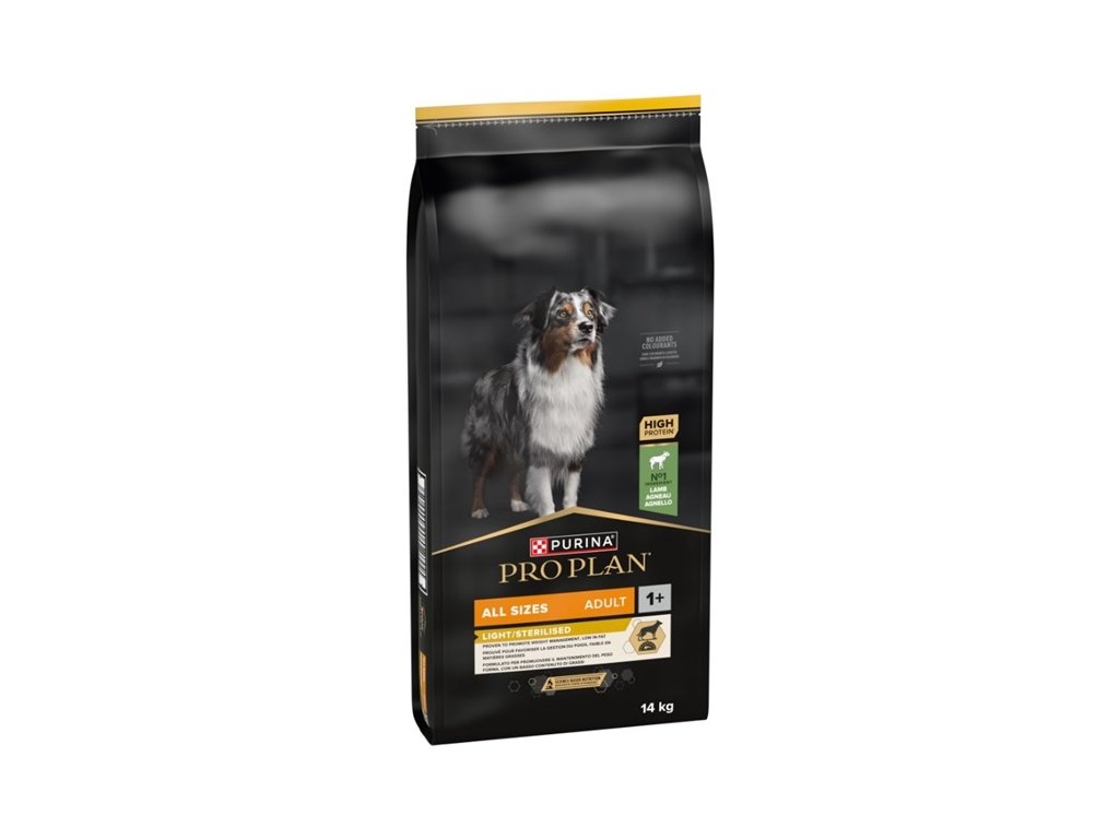 Pro Plan All Sizes Adult Light/Sterilised je kompletní krmivo s jehněčím masem pro dospělé psy všech plemen, kteří jsou náchylnější k přibírání na váze v důsledku snížené aktivity nebo kastrace. Správným dávkováním lze docílit snížení hmotnosti a zabránění vzniku nadváhy. Granule Pro Plan s kvalitním jehněčím snižují pocit hladu a napomáhají udržet ideální hmotnost díky vysokému obsahu bílkovin, sníženému podílu tuku a dostatku vlákniny. Vitamín D, minerální látky a omega-3 mastné kyseliny se postarají o zdraví zoubků a dásní.