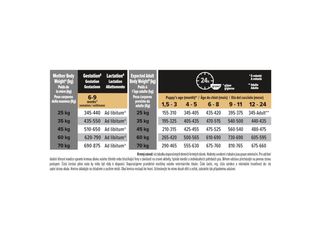 Krmný návod: viz tabulka doporučených denních krmných dávek. Hodnoty uvedené v tabulce jsou pouze orientační. Pro udržení ideální tělesné kondice upravte krmnou dávku vašeho štěněte nebo březí/kojící feny v závislosti na úrovni aktivity, fyzické kondici a individuálních potřebách psa. Během odstavu přecházejte na pevnou stravu postupně. Čistá čerstvá pitná voda by měla být vždy k dispozici. Doporučujeme pravidelné návštěvy vašeho veterinárního lékaře.
