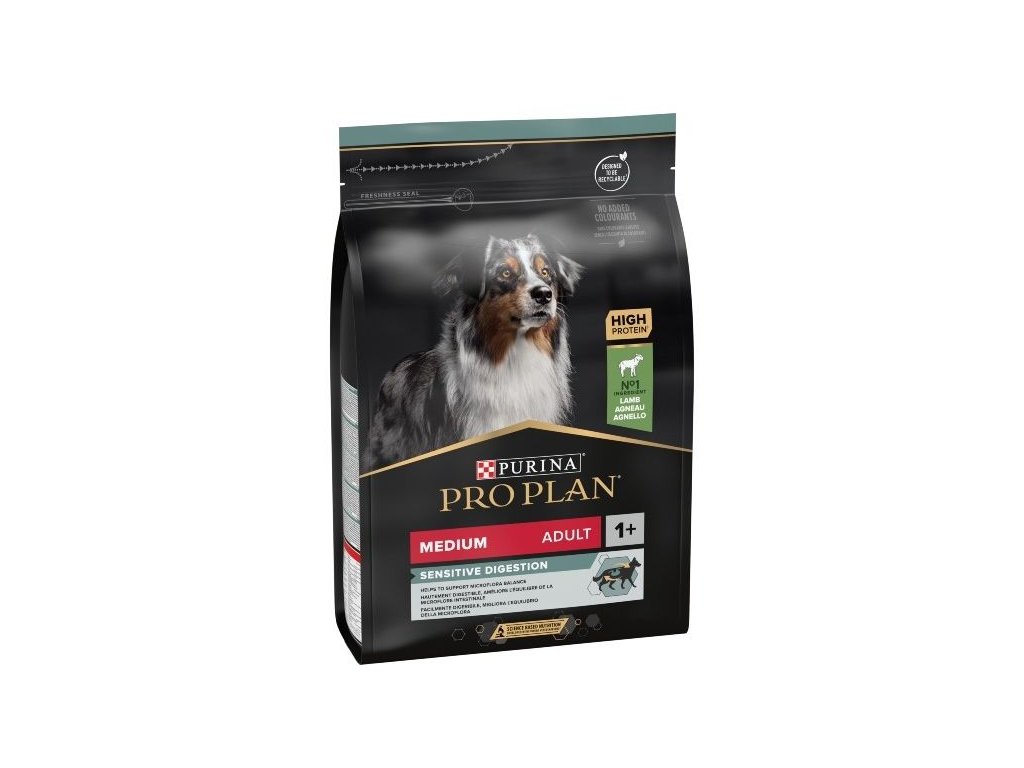 Krmivo Purina PRO PLAN® Sensitive Digestion MEDIUM ADULT bylo vyvinuto pro dospělé psy středních plemen (s hmotností 10–25 kg). Granule obsahují vitamín D a minerální látky, které podporují silné a zdravé zuby. Krmivo má velký podíl vysoce kvalitního jehněčího, a tak zajišťuje optimální výživu středně velkých psů od 12 měsíců věku do 7 let. Následně byste měli přejít na produkty z řady Age Defence. Objevte výhody, které mají produkty Sensitive Digestion pro každodenní zdraví a pohodu vašeho psa.