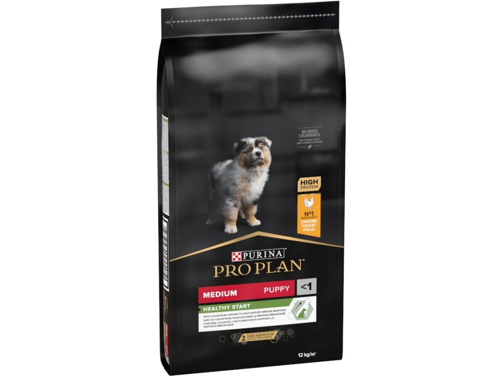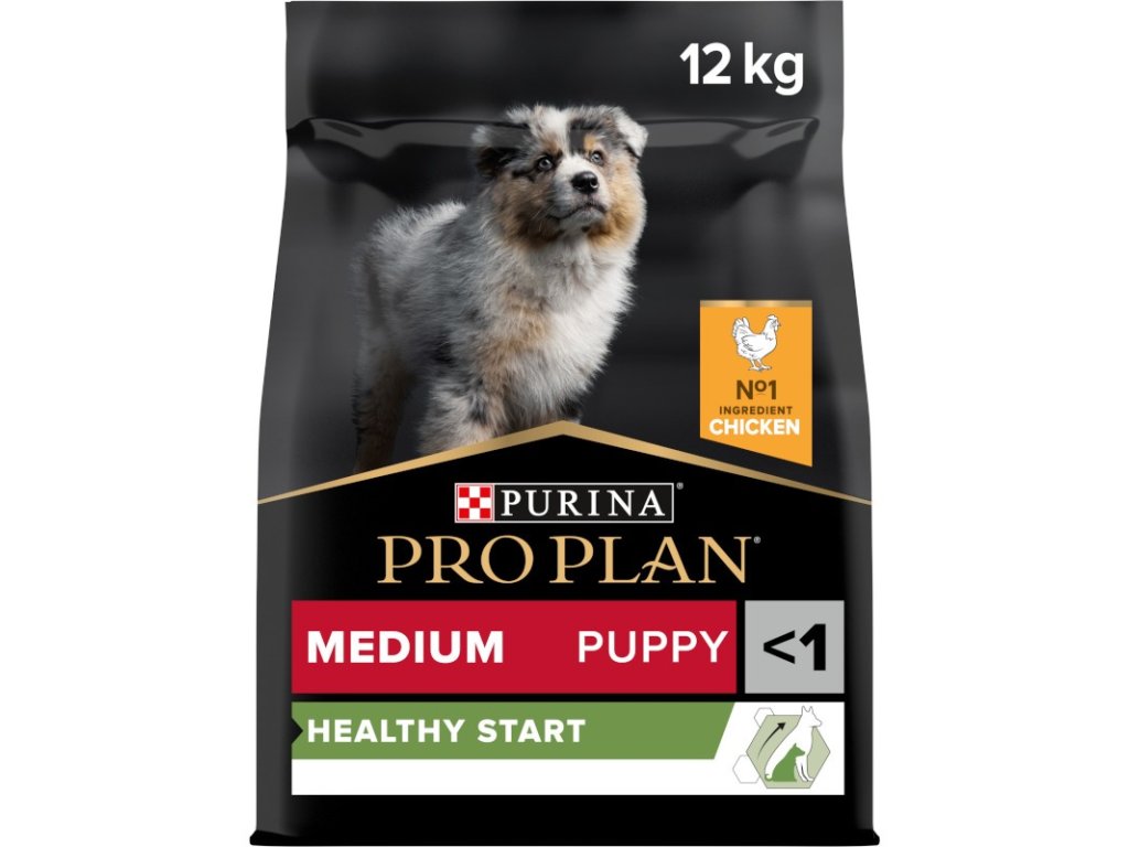 Krmivo Purina PRO PLAN® Healthy Start MEDIUM PUPPY je vhodné pro štěňata středních plemen (s hmotností 10–25 kg v dospělosti). Tyto granule pro štěňata obsahují vitamín D, minerální látky a specifické množství omega-3 mastných kyselin (0,3 %), které přispívají ke zdraví zubů a dásní. Krmivo má vysoký podíl kvalitního kuřecího, a tak zajišťuje optimální výživu pro rostoucí štěňata středních plemen. To vše až do věku 12 měsíců, kdy přejdou na produkty řady ADULT.