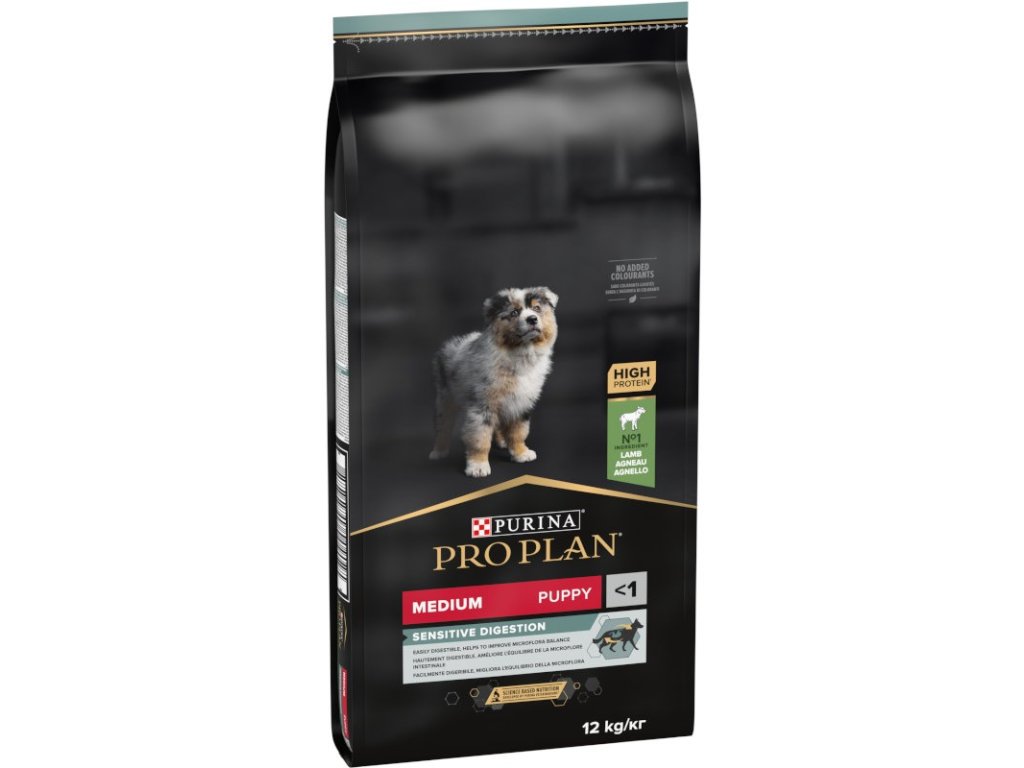 Krmivo Purina PRO PLAN® Sensitive Digestion MEDIUM PUPPY bylo vyvinuto pro štěňata středních plemen (váha v dospělosti 10–25 kg). Tyto granule pro štěňata obsahují vitamín D a minerální látky, které podporují silné a zdravé zuby. Krmivo má velký podíl vysoce kvalitního jehněčího, a tak zajišťuje optimální výživu štěňat středních plemen až do 12 měsíců. Následně byste měli přejít na produkty z řady Adult.