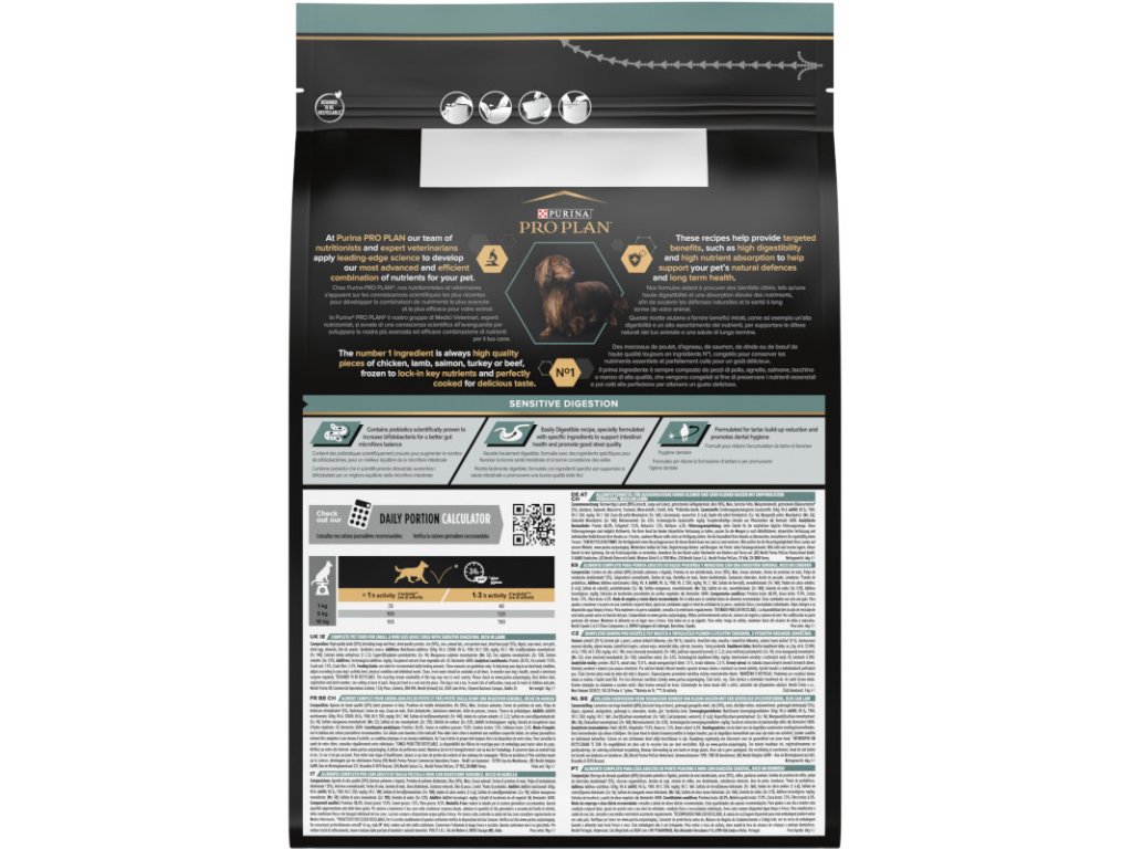 Hlavní složkou krmiva pro psy Purina PRO PLAN® Sensitive Digestion jsou kvalitní kousky jehněčího a další vysoce stravitelné složky, které usnadňují trávicí proces. Granule obsahují také prebiotika, u nichž bylo vědecky prokázáno, že zvyšují množství bifidobakterií, které zlepšují rovnováhu střevní mikroflóry, a bentonit (přírodní jíl), který podporuje správné vyprazdňování. Vysoký obsah bílkovin pomáhá udržovat silné svaly a ideální kondici.