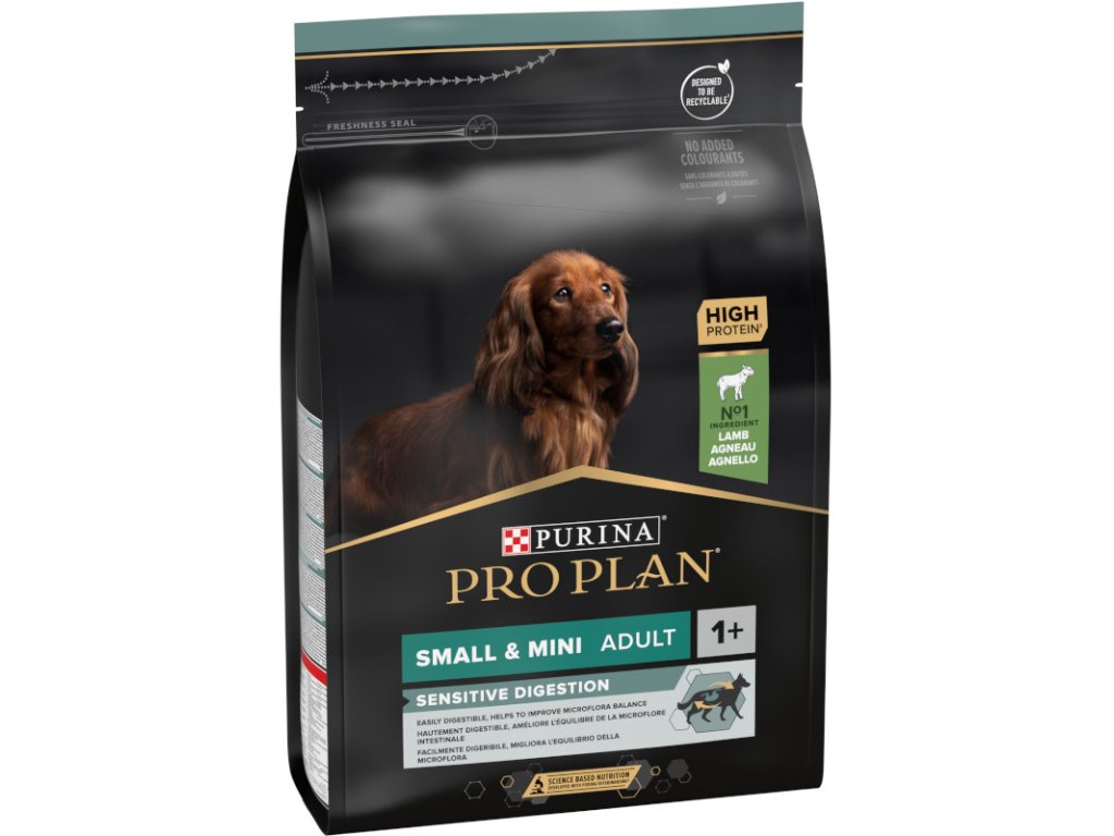 Krmivo Purina PRO PLAN® Sensitive Digestion SMALL&MINI ADULT bylo vyvinuto pro dospělé psy malých a trpasličích plemen (s hmotností méně než 10 kg). Granule obsahují vitamín D a minerální látky, které podporují silné a zdravé zuby. Krmivo má velký podíl vysoce kvalitního jehněčího, a tak zajišťuje optimální výživu malých a trpasličích psů od 12 měsíců věku do 9 let. Následně byste měli přejít na produkty z řady Age Defence.