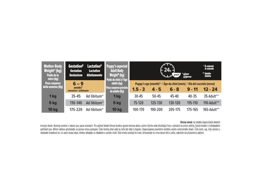 Krmný návod: viz tabulka doporučených denních krmných dávek. Hodnoty uvedené v tabulce jsou pouze orientační. Pro udržení ideální tělesné kondice upravte krmnou dávku vašeho štěněte nebo březí/kojící feny v závislosti na úrovni aktivity, fyzické kondici a individuálních potřebách psa. Během odstavu přecházejte na pevnou stravu postupně. Čistá čerstvá pitná voda by měla být vždy k dispozici. Doporučujeme pravidelné návštěvy vašeho veterinárního lékaře.